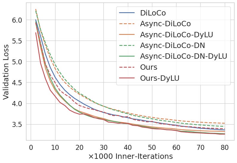 To cater for heterogeneous GPUs, one trick is to adjust the number of inner-steps to be inversely proportional to the compute capability of the GPU, balancing the time taken per inner-optimization in each GPU. This approach is called DyLU, which improves all asynchronous methods including ours.